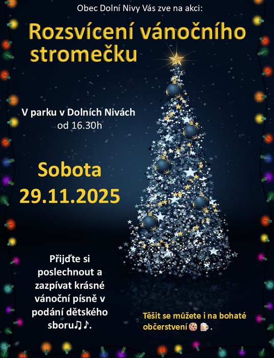 Obec Dolní Nivy Vás zve na Rozsvícení vánočního stromečku v sobotu 29. 11. 2025 od 16:30 v parku v Dolních Nivách.